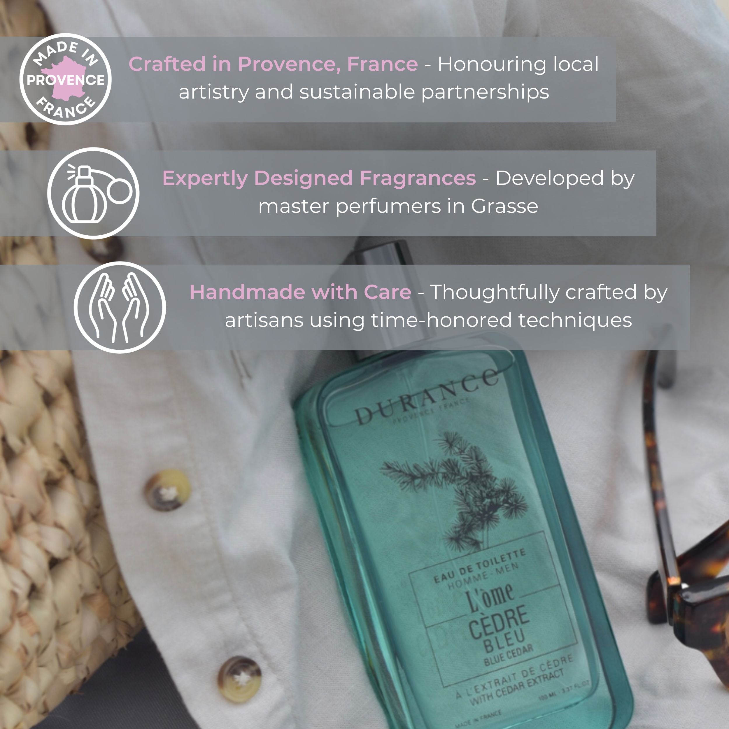 Experience the crisp, calming aroma of Durance Eau De Toilette Blue Cedar — a refined woody scent that blends smooth cedarwood with fresh, aromatic notes. Perfect for those who appreciate sophisticated, natural fragrances that evoke the tranquillity of forest breezes and blue skies.